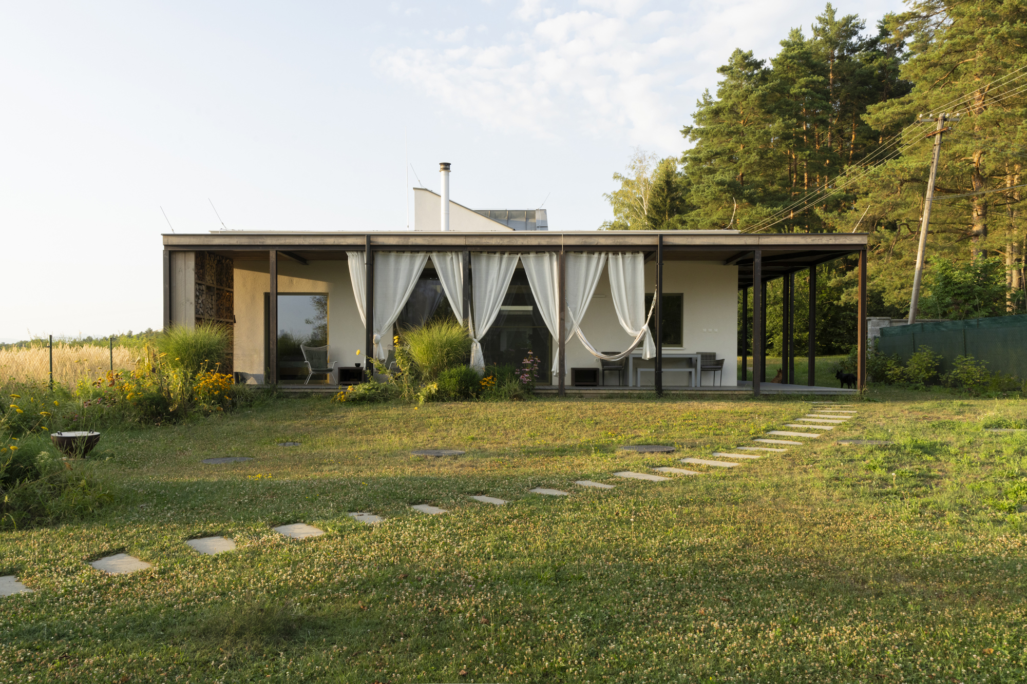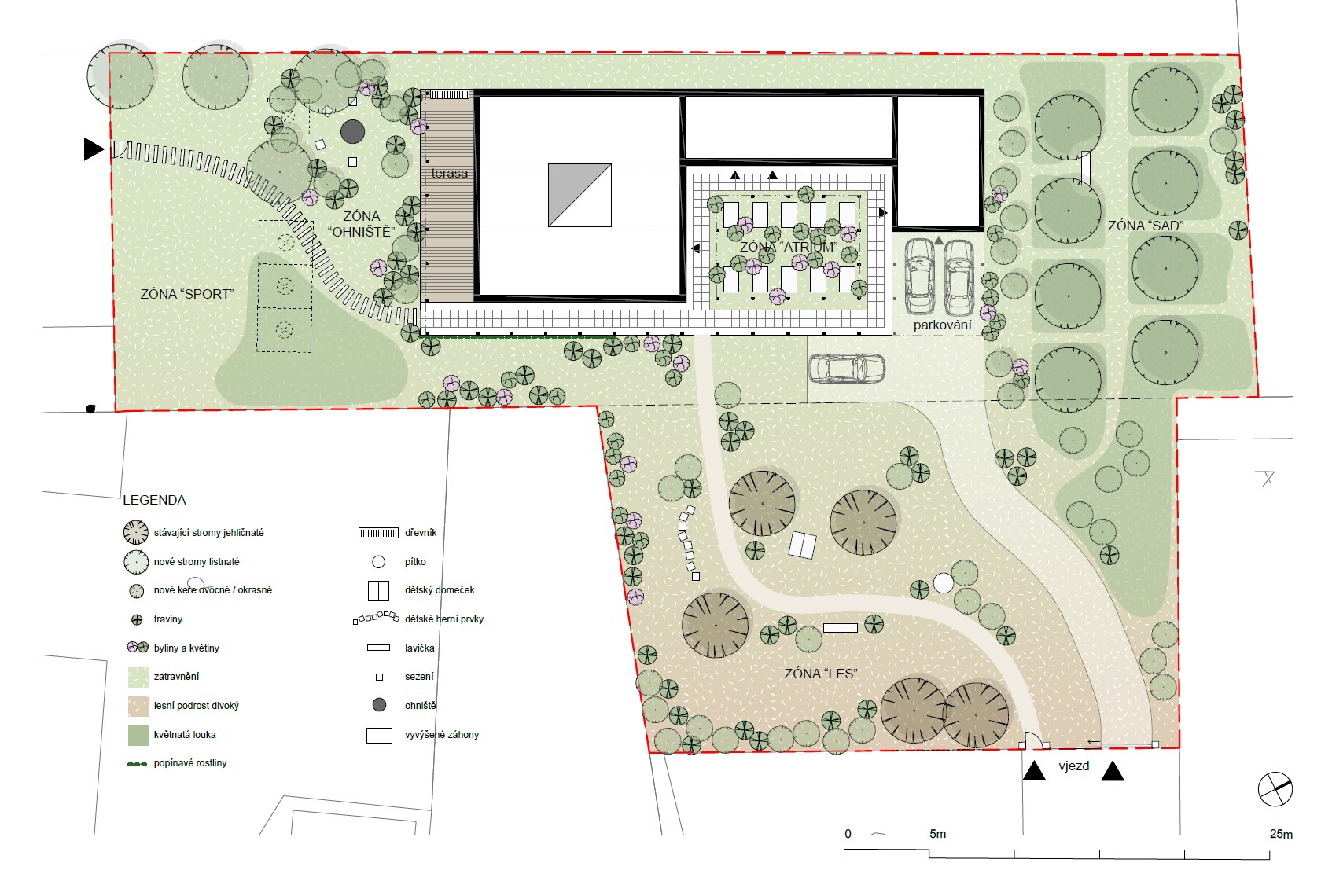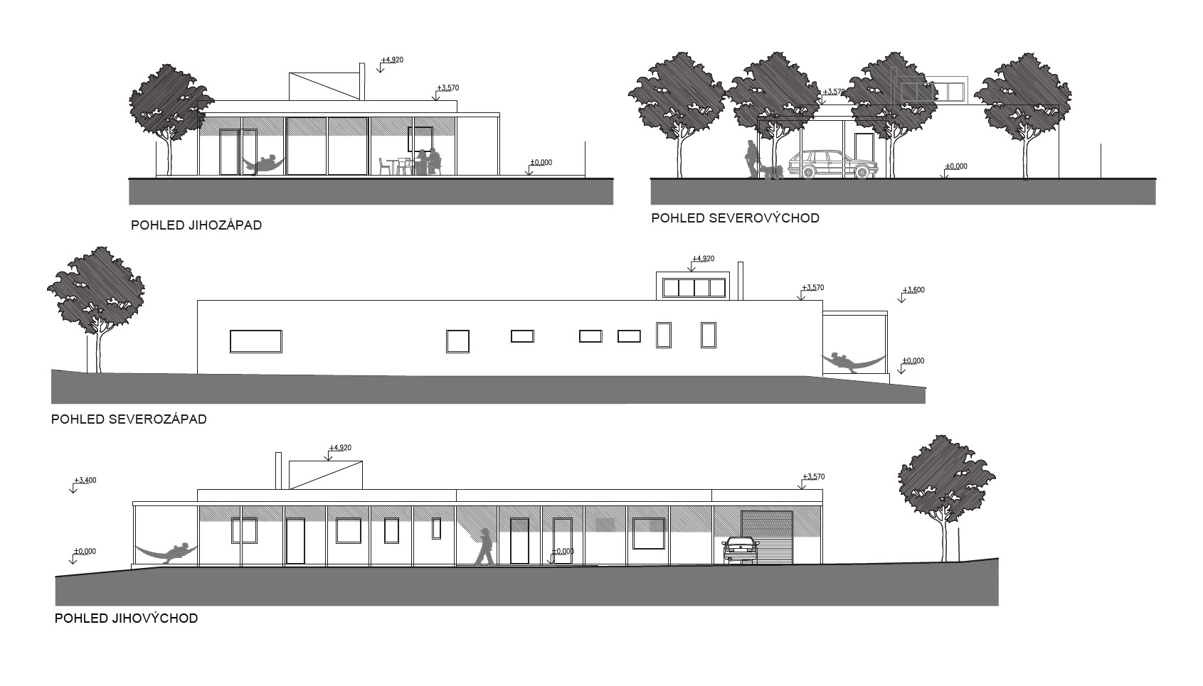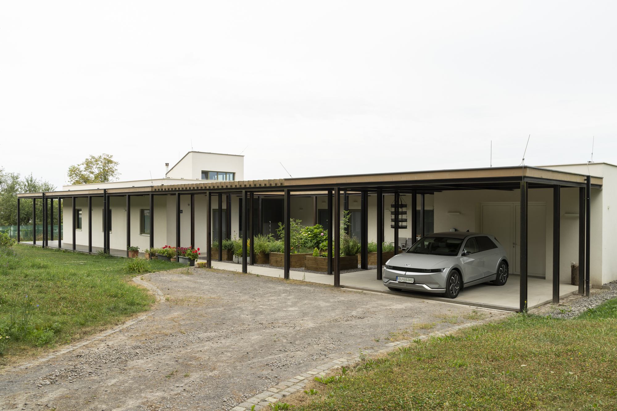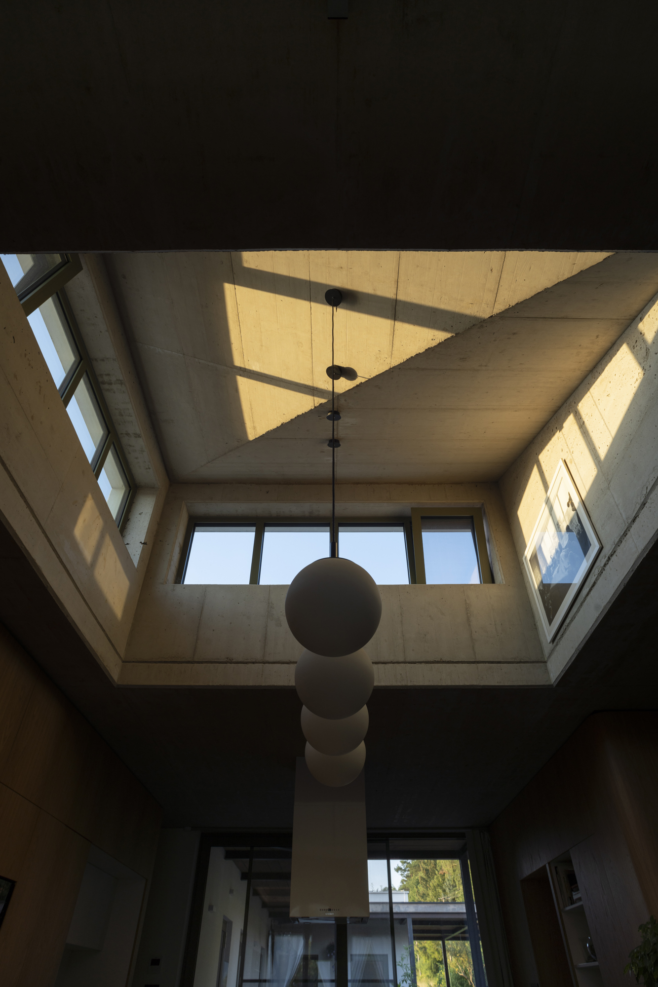 Tento rodinný dům átriového typu je velkorysý, kompaktní, užívá světlík a atrium a pracuje se světlem. Dispozice vychází z uspořádání v rastru čtverců 4x4m. Prostory se tak přirozeně prolínají a vytváří příjemné pobytové zóny bez nadbytečných komunikačních prostor a konstrukcí. Rodinný dům je čtvercový s dominantním světlíkem uprostřed, k němu přiléhá objekt garsonky a garáže. Objekty jsou doplněny o pergoly, plnící funkci jak zastřešení komunikačních a pobytových prostor v zahradě, tak stínění prosklených ploch domu, a však konstrukce objektu je převyšující, dává tak najevo svou přítomnost a dominanci.