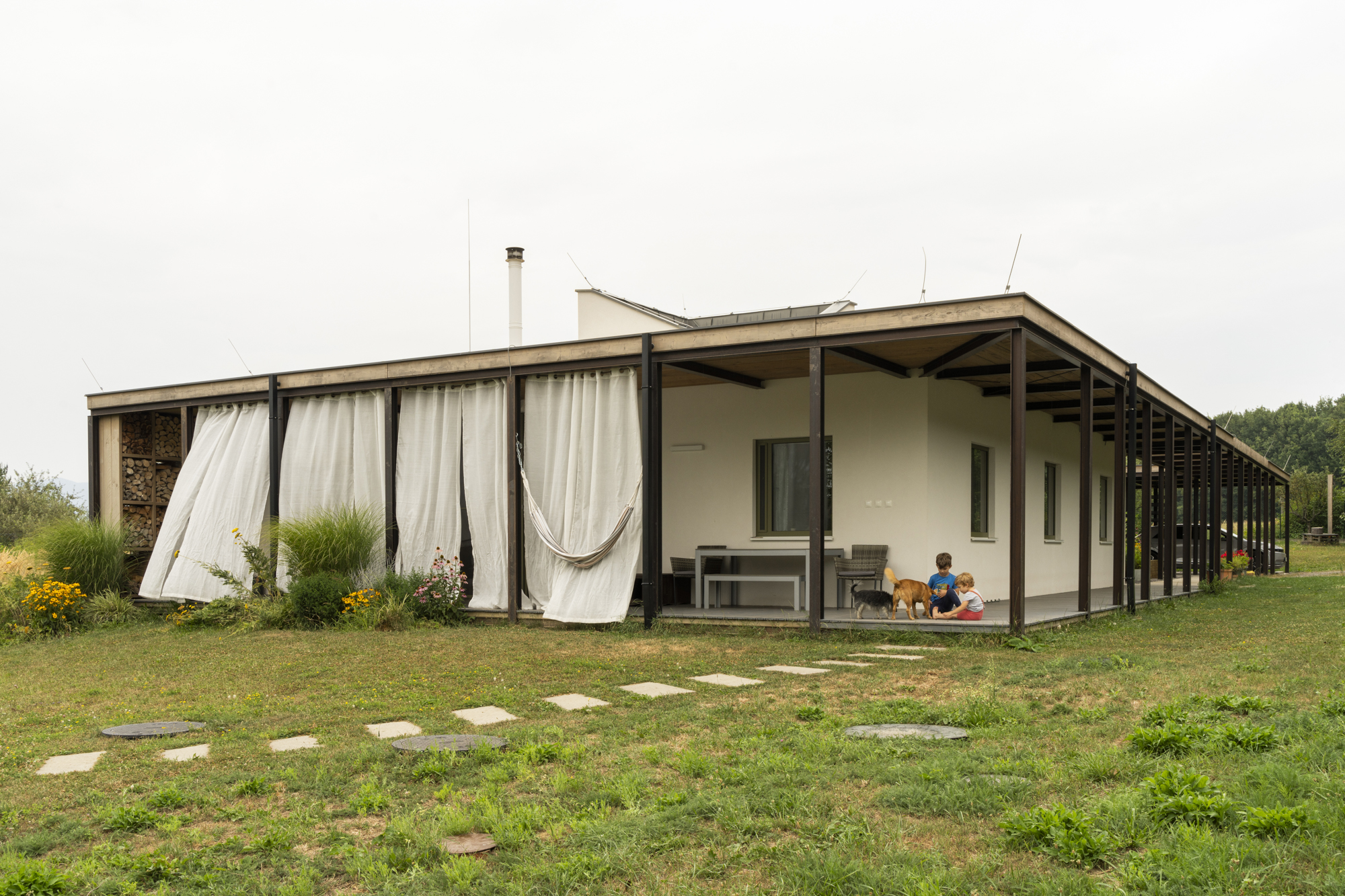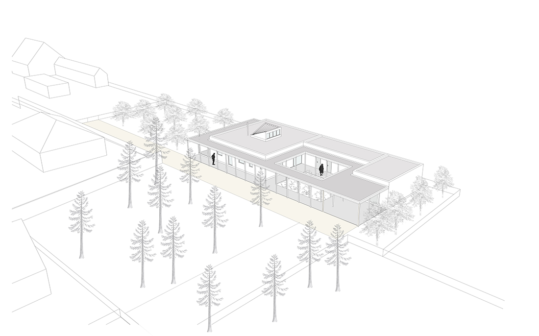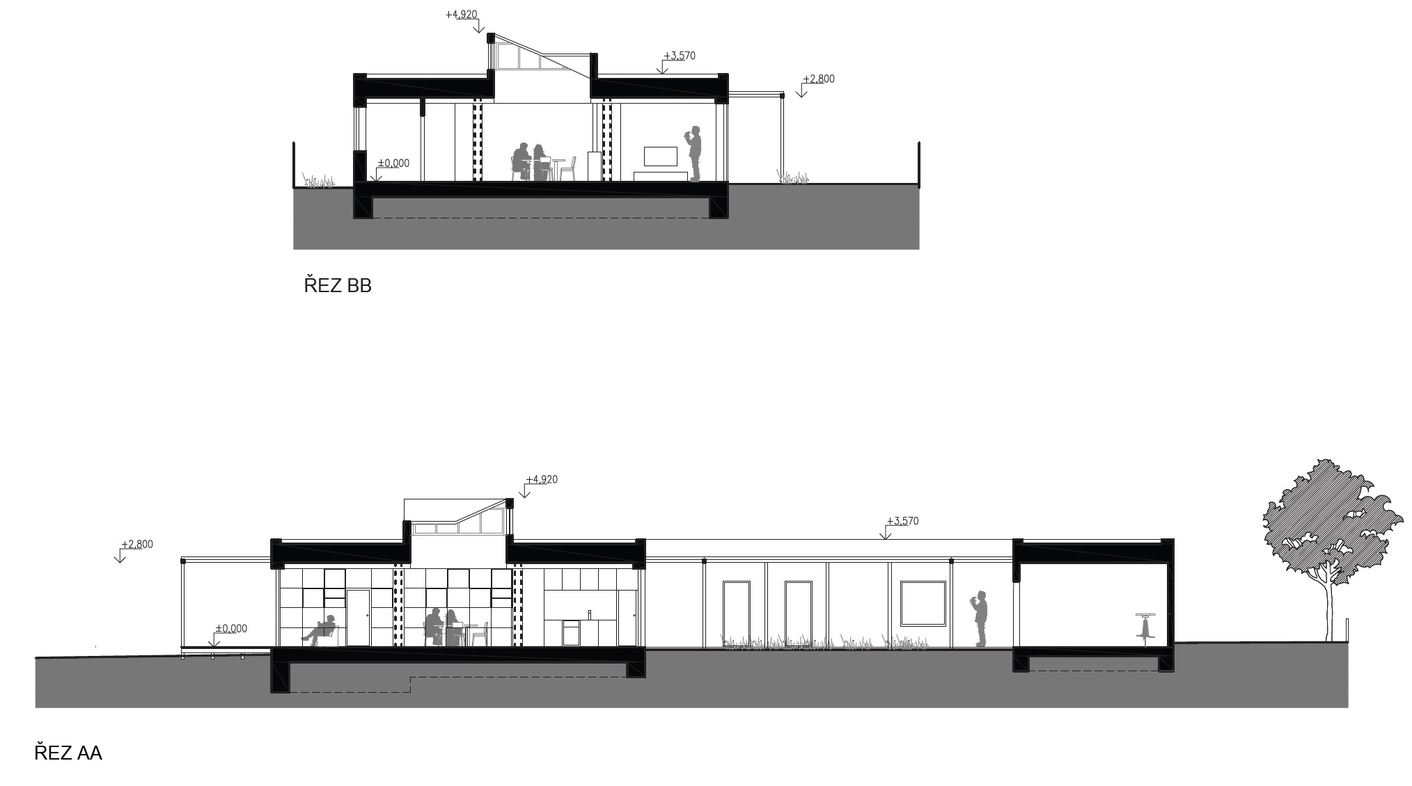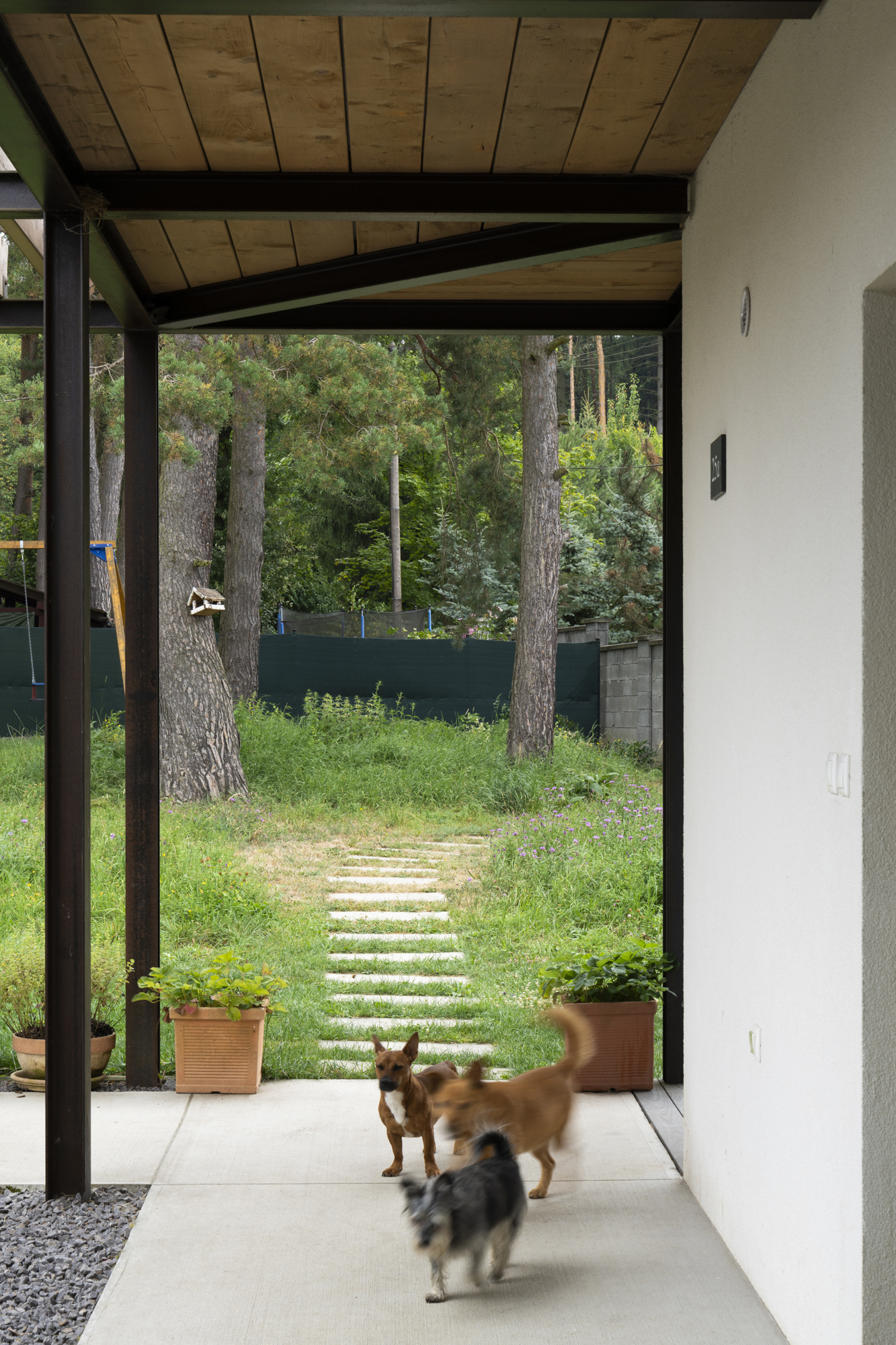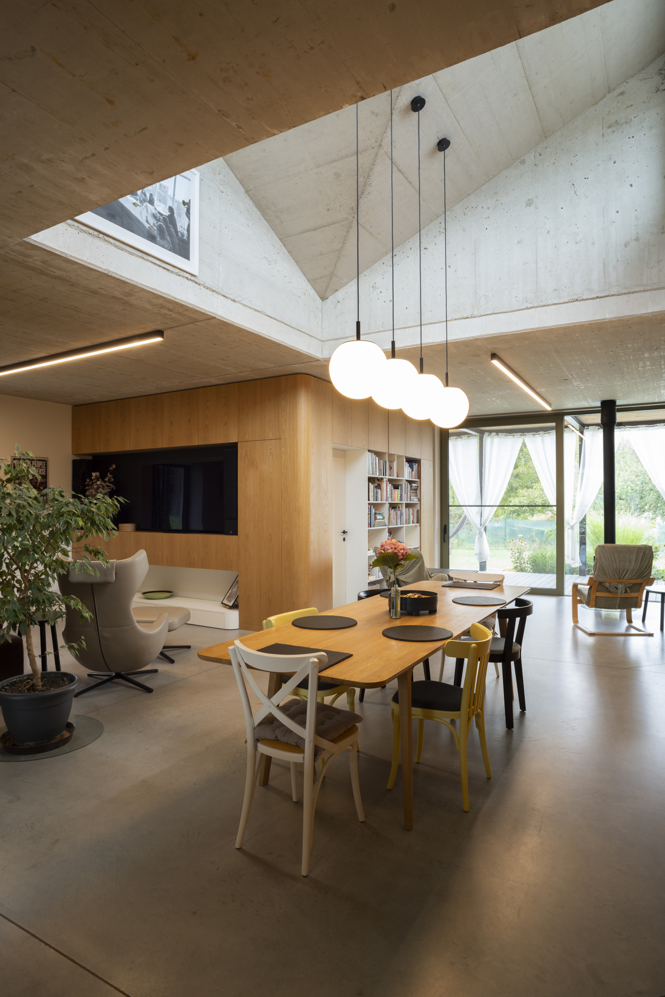 Tento rodinný dům átriového typu je velkorysý, kompaktní, užívá světlík a atrium a pracuje se světlem. Dispozice vychází z uspořádání v rastru čtverců 4x4m. Prostory se tak přirozeně prolínají a vytváří příjemné pobytové zóny bez nadbytečných komunikačních prostor a konstrukcí. Rodinný dům je čtvercový s dominantním světlíkem uprostřed, k němu přiléhá objekt garsonky a garáže. Objekty jsou doplněny o pergoly, plnící funkci jak zastřešení komunikačních a pobytových prostor v zahradě, tak stínění prosklených ploch domu, a však konstrukce objektu je převyšující, dává tak najevo svou přítomnost a dominanci.