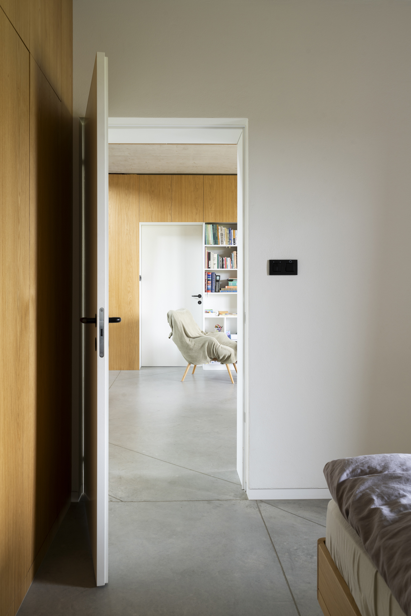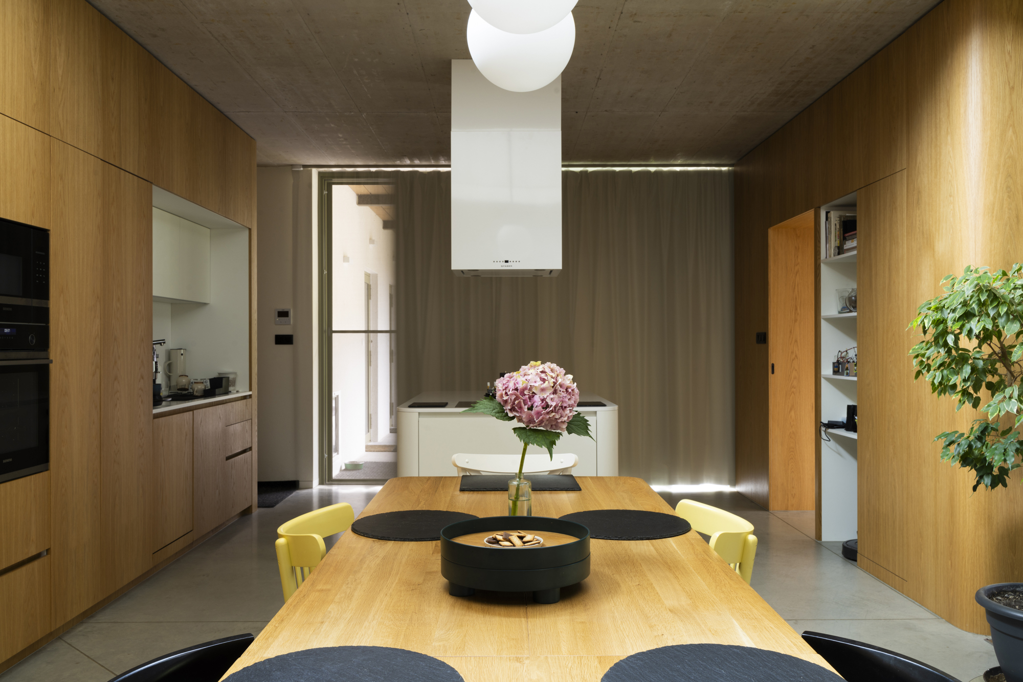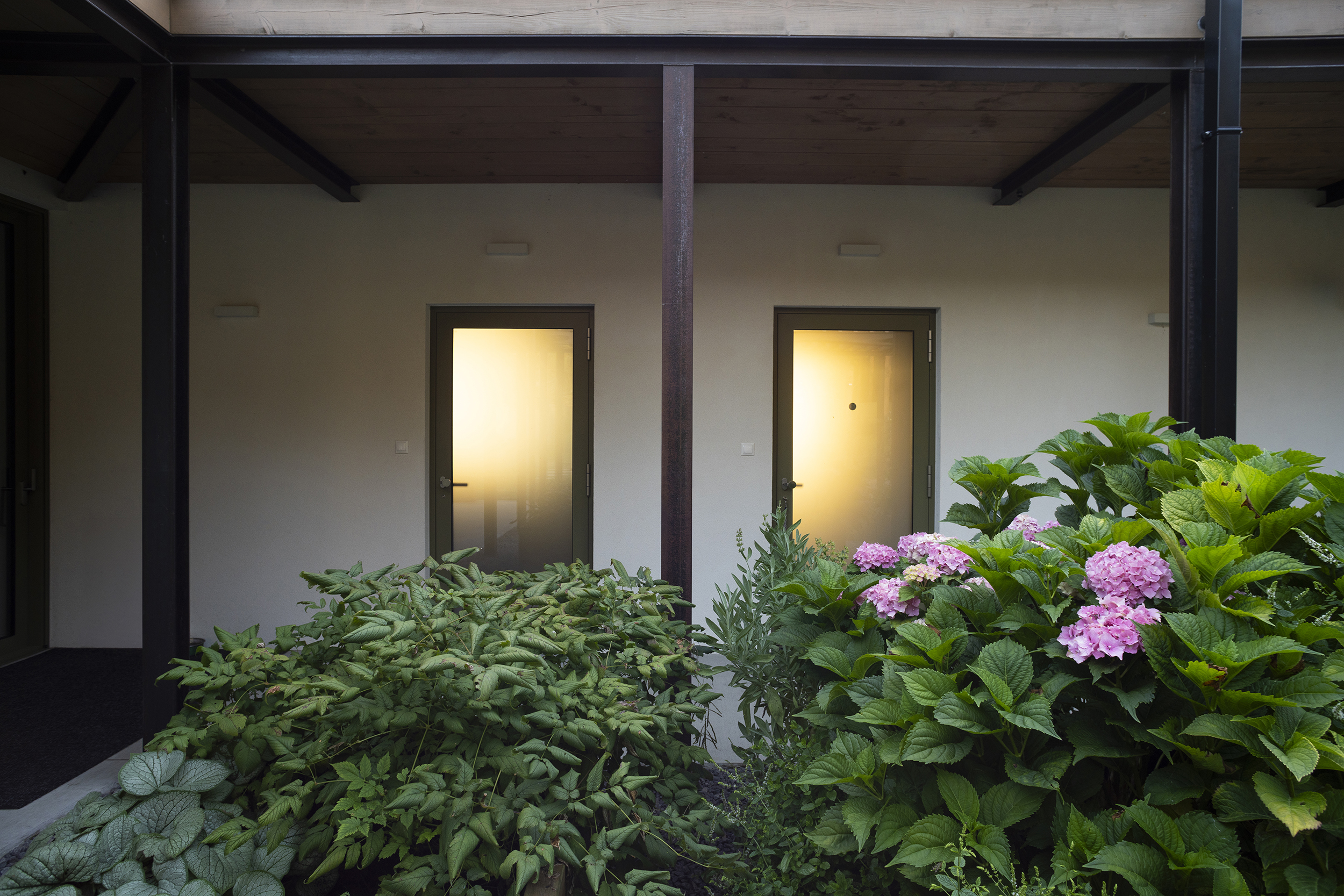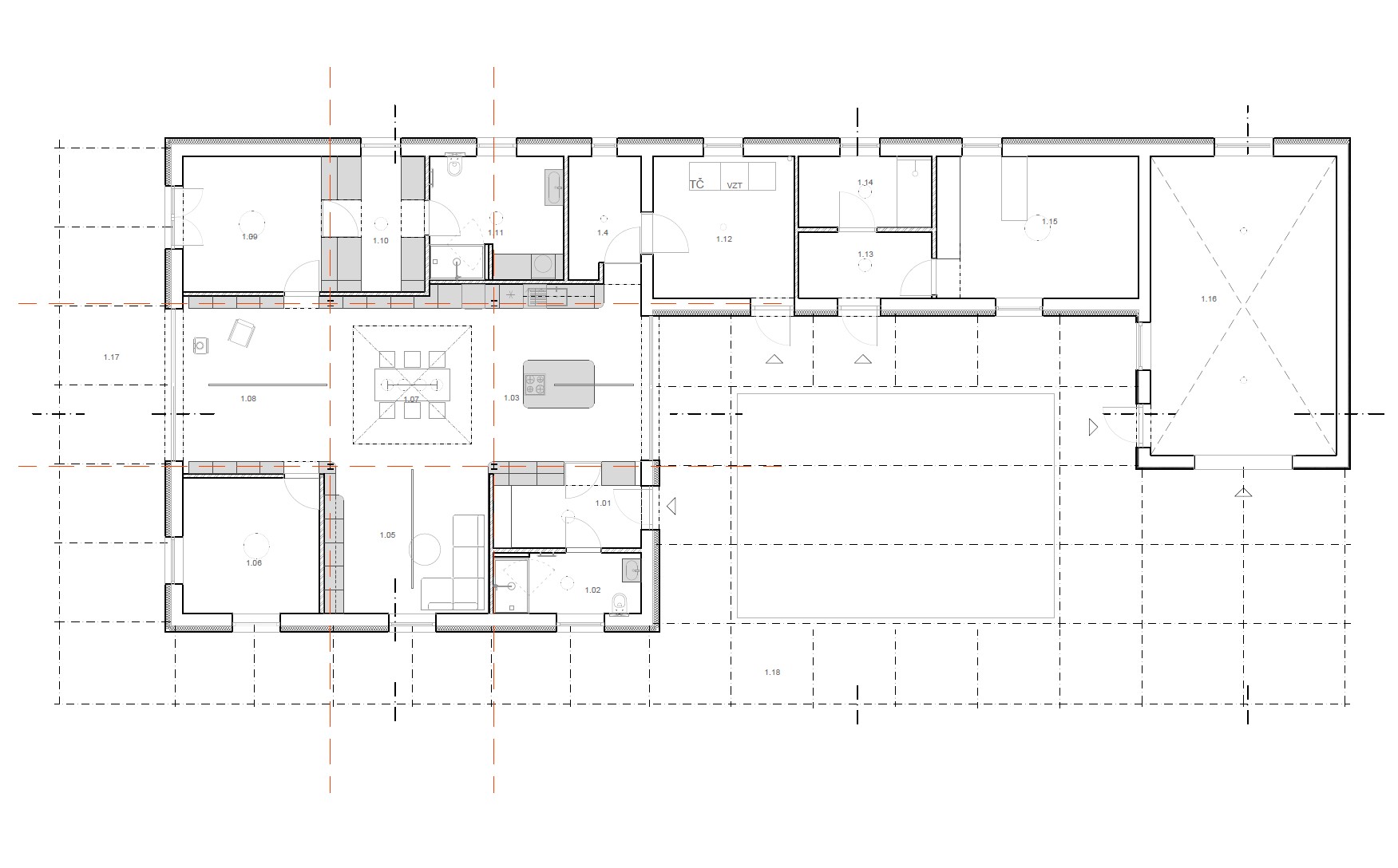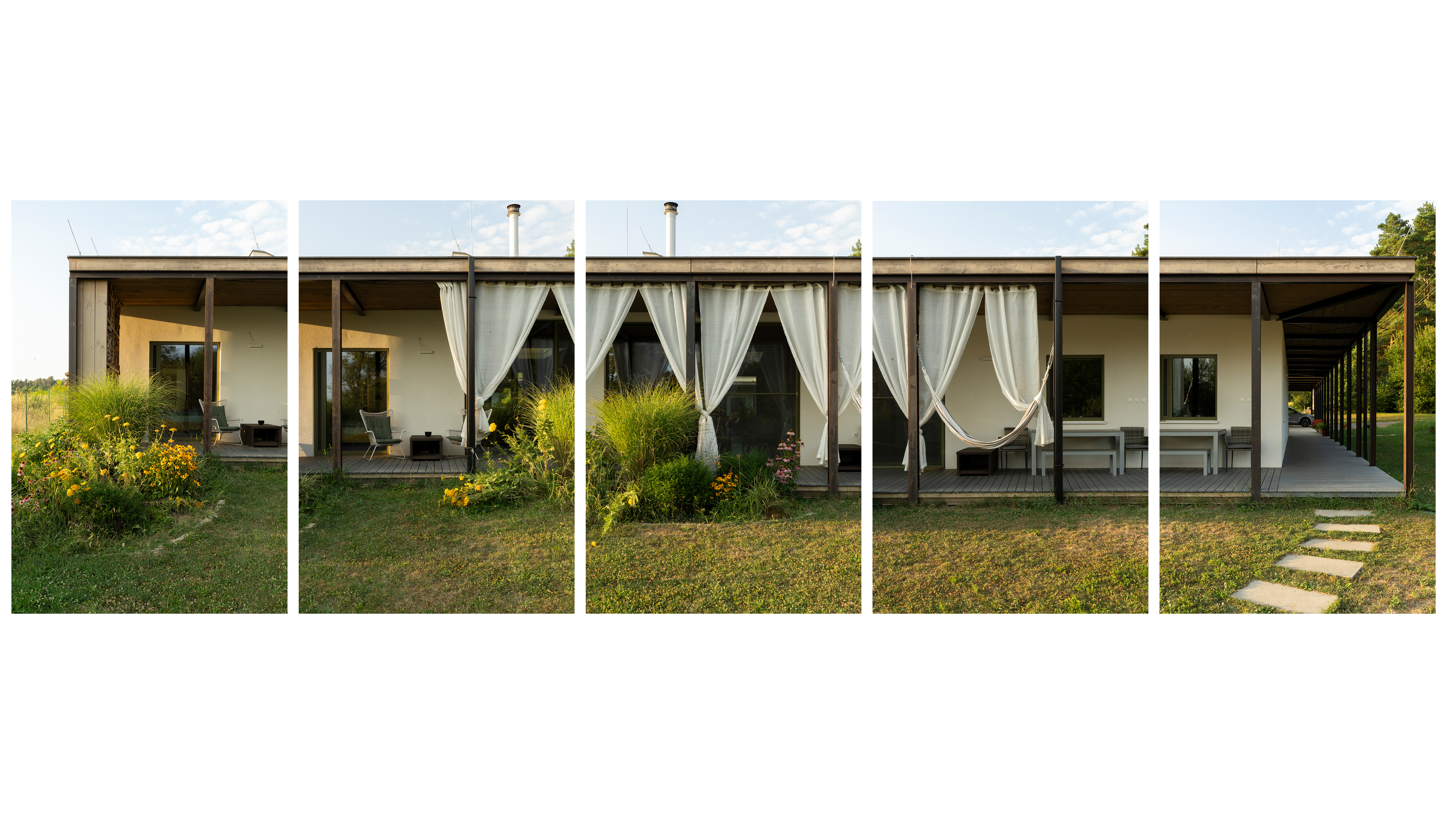 Tento rodinný dům átriového typu je velkorysý, kompaktní, užívá světlík a atrium a pracuje se světlem. Dispozice vychází z uspořádání v rastru čtverců 4x4m. Prostory se tak přirozeně prolínají a vytváří příjemné pobytové zóny bez nadbytečných komunikačních prostor a konstrukcí. Rodinný dům je čtvercový s dominantním světlíkem uprostřed, k němu přiléhá objekt garsonky a garáže. Objekty jsou doplněny o pergoly, plnící funkci jak zastřešení komunikačních a pobytových prostor v zahradě, tak stínění prosklených ploch domu, a však konstrukce objektu je převyšující, dává tak najevo svou přítomnost a dominanci.