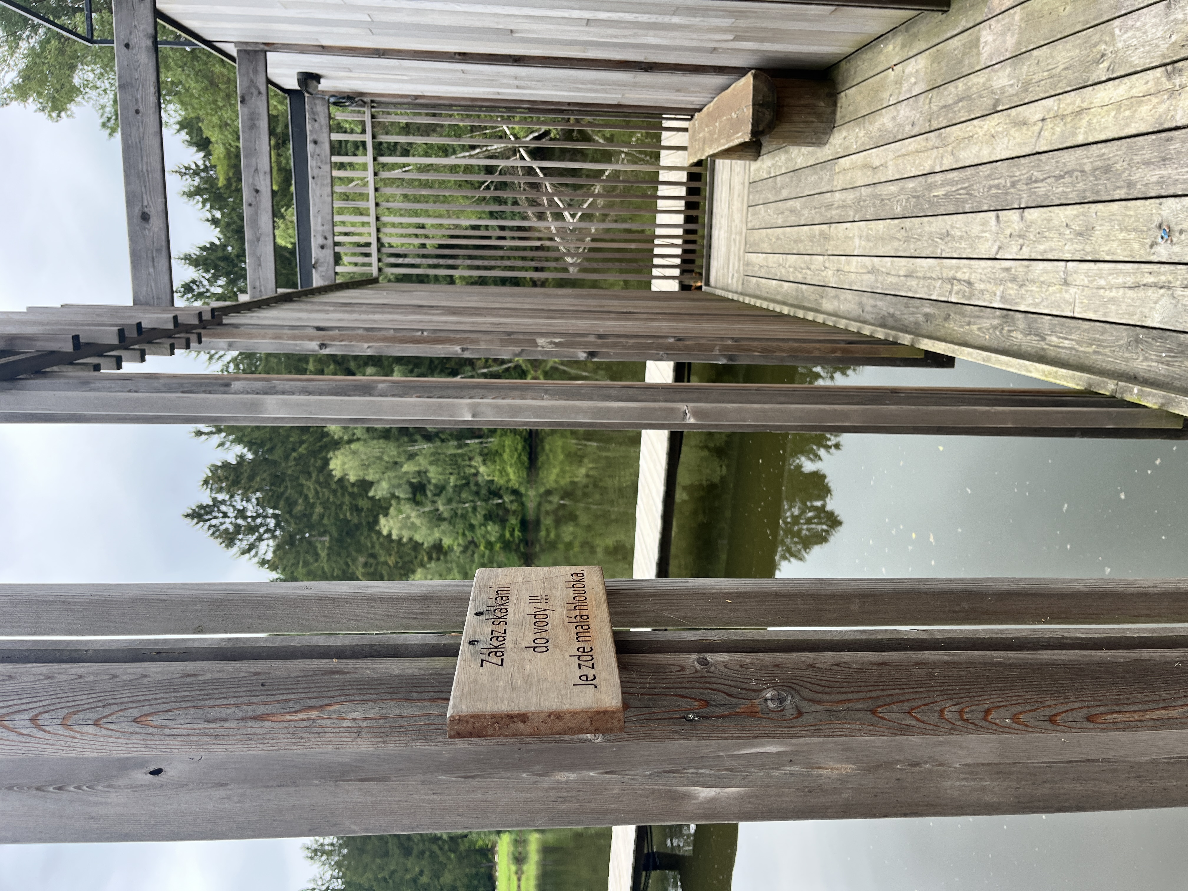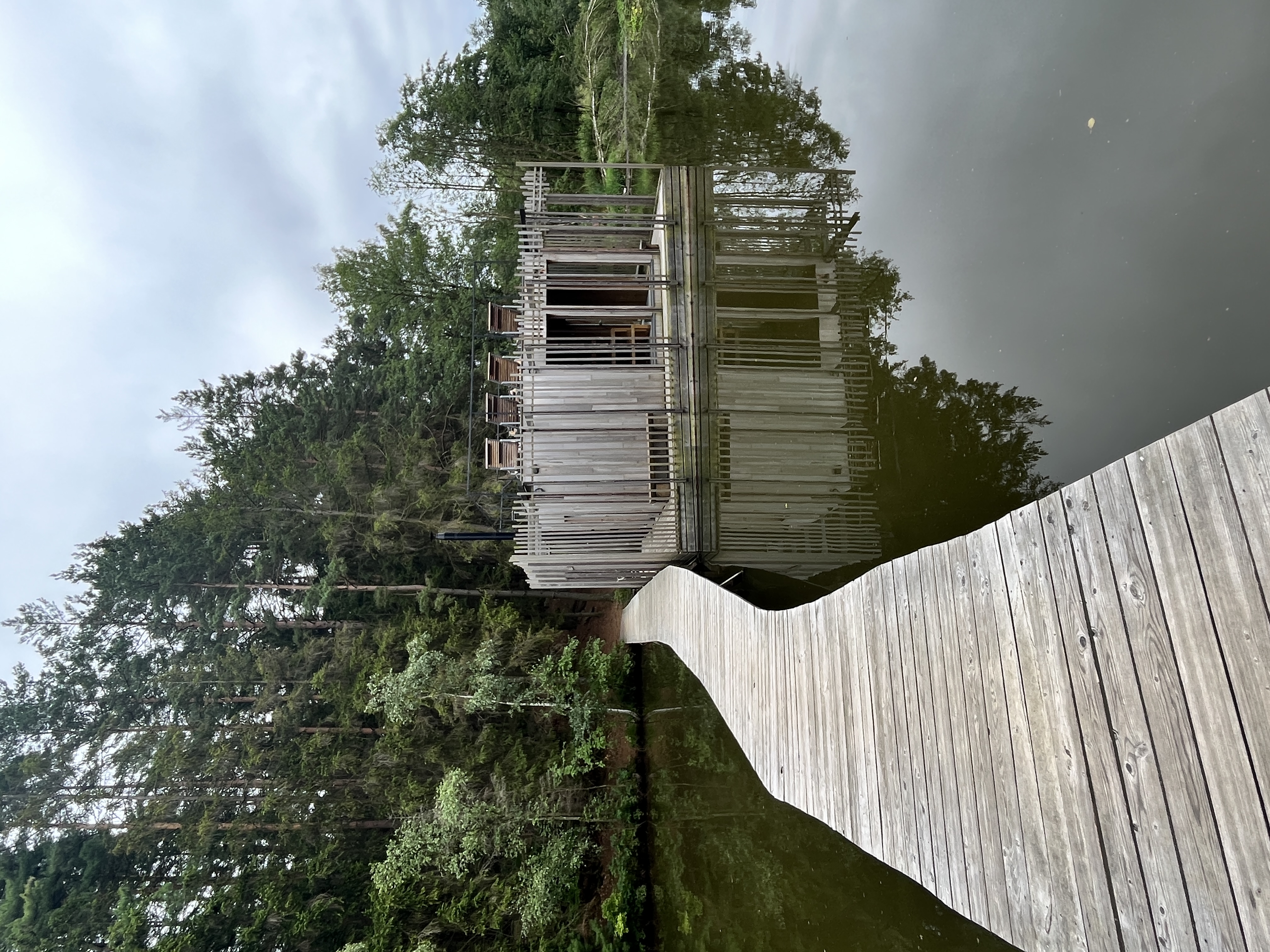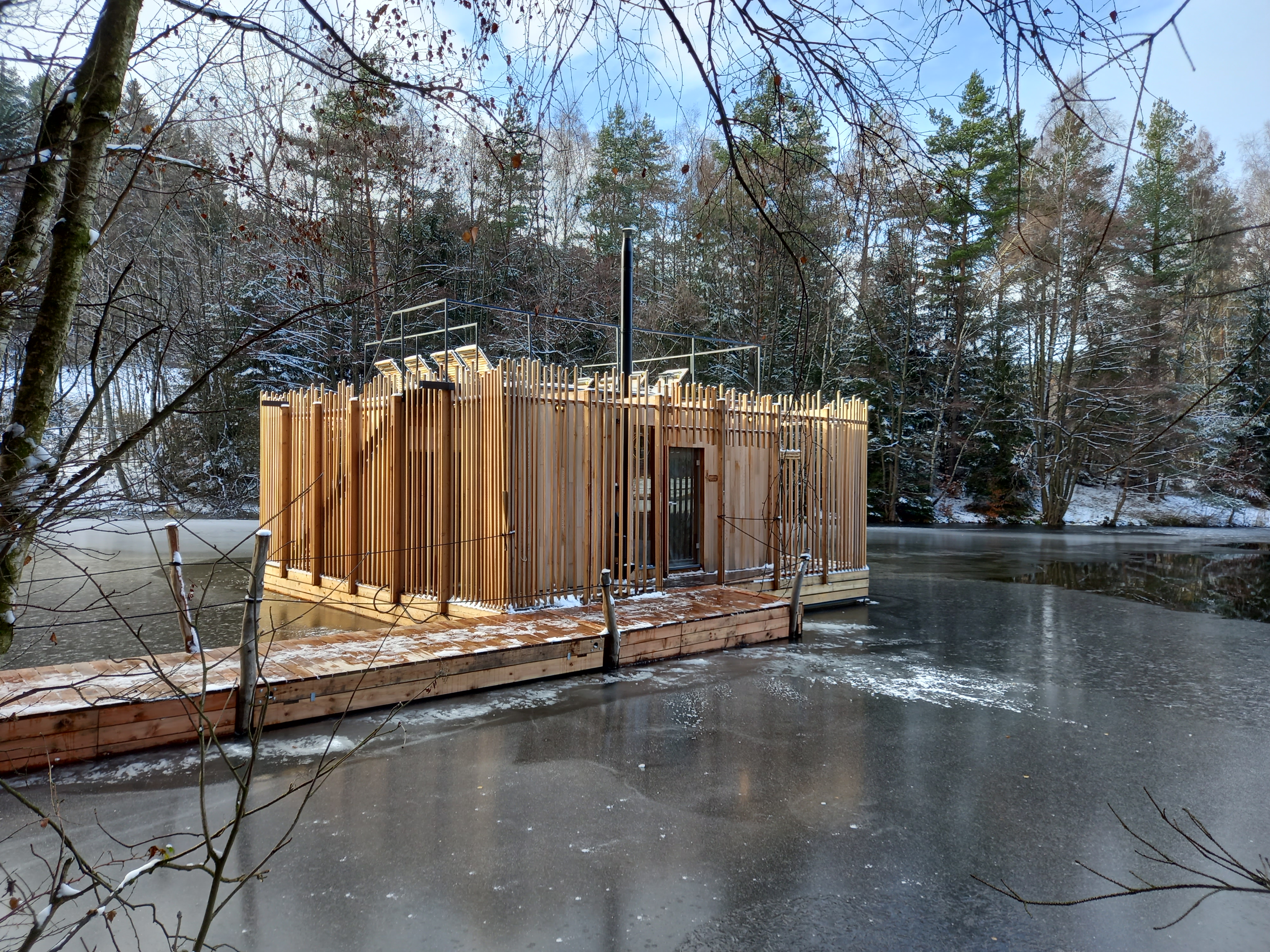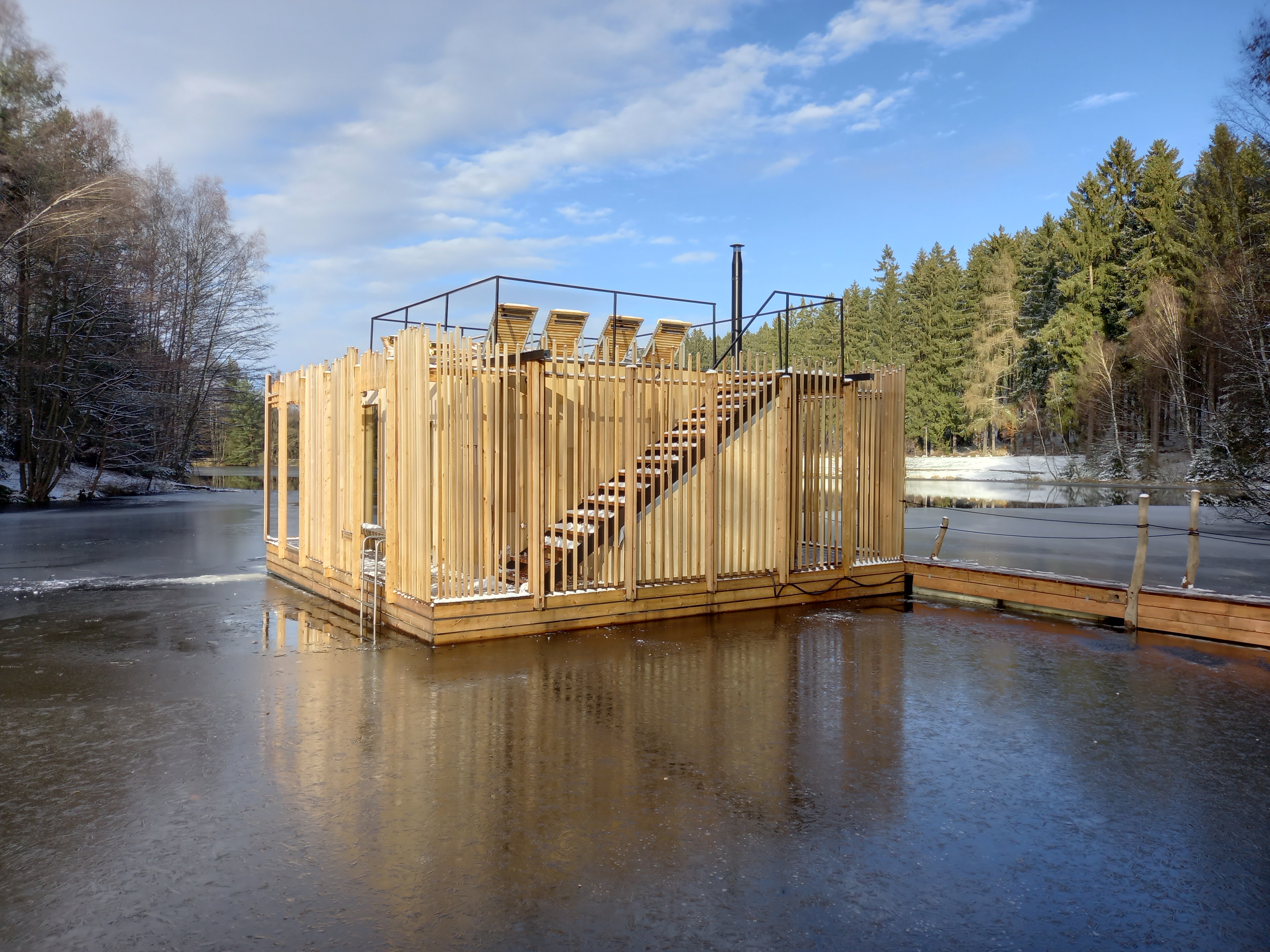 Sauna je navržena na základě požadavků klienta, tak aby návštěvníkům nabídla nevšední zážitek v podobě klidného saunování na rybníce nedaleko nabízeného ubytování. Pro konstrukci sauny bylo využito cedrové dřevo, které je lehké a má skvělé tepelněizolační vlastnosti navíc uvolňuje přírodní jemné vůně léčivých esenciálních olejů, které se pro saunovací rituál perfektně hodí. Okolo samotné prohřívárny je navržen ochoz tvořen nepravidelným laťováním, který návštěvníkům navodí relaxační atmosféru a díky kterému sauna splyne s okolím. Spojení sauny se břehem dlouhým plovoucím molem dodává objektu jeho jedinečnost.