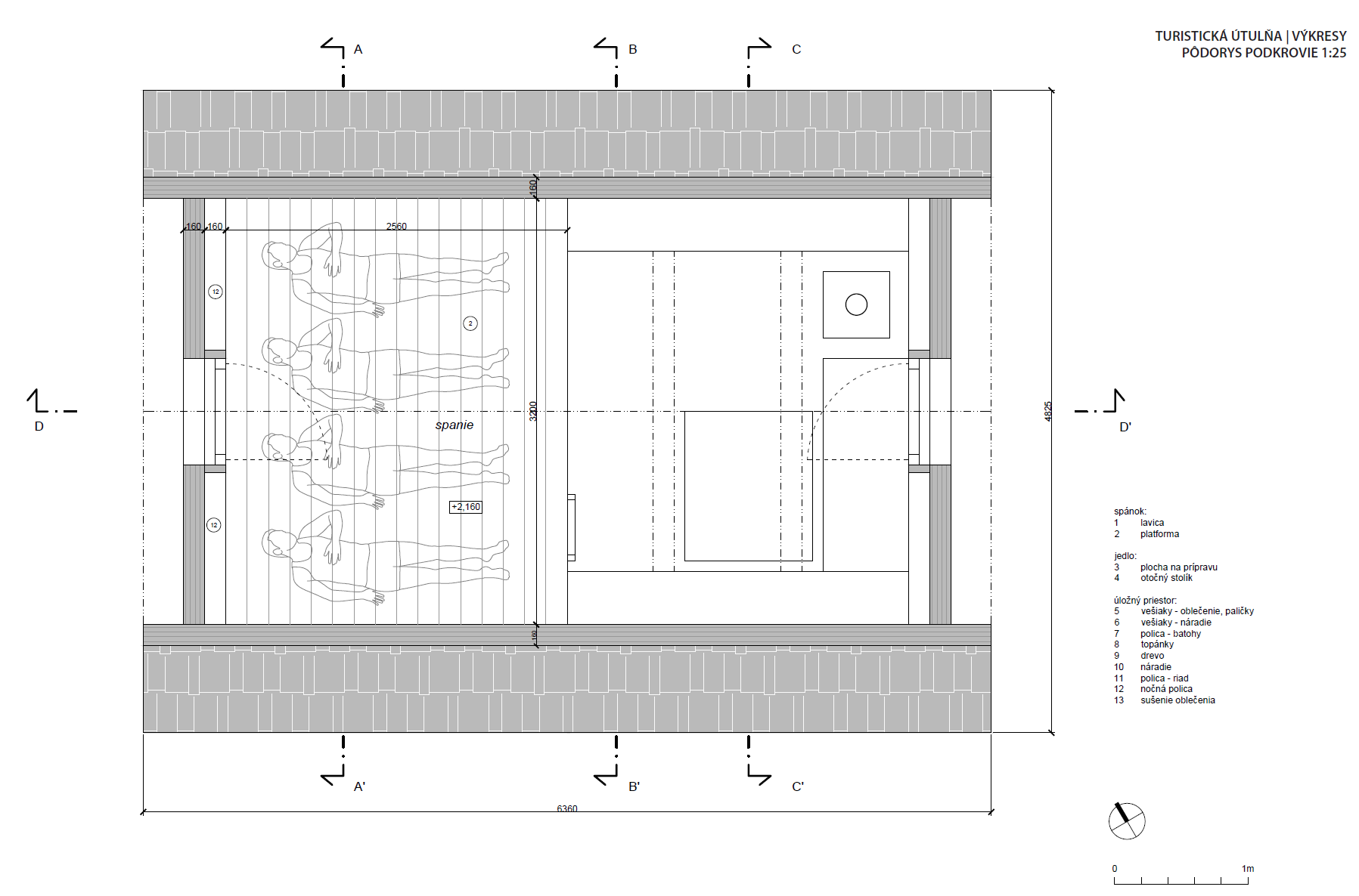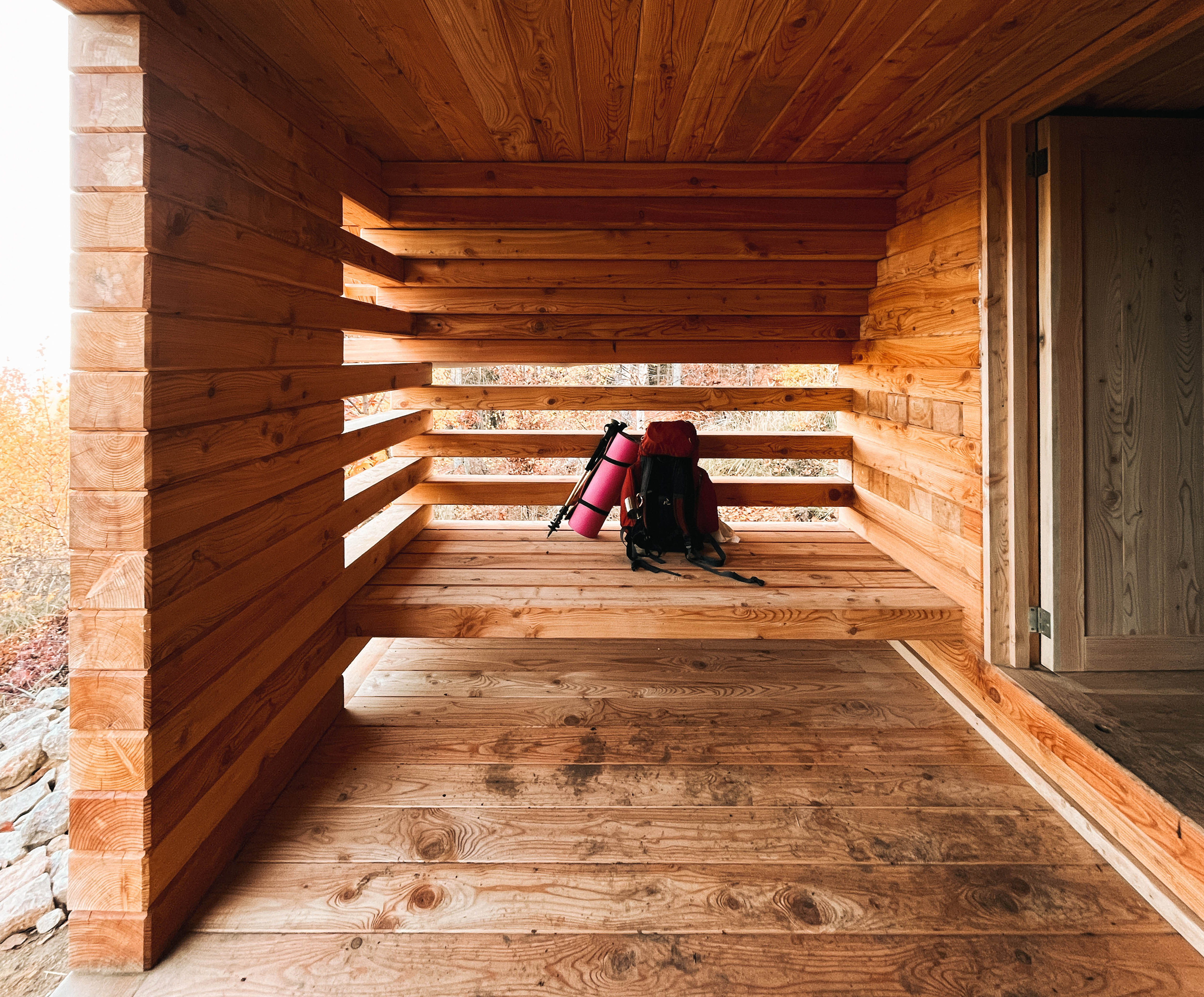 Útulňa stojí na nízkej kamennej podmurovke a je orientovaná štítom kolmo k terénu.